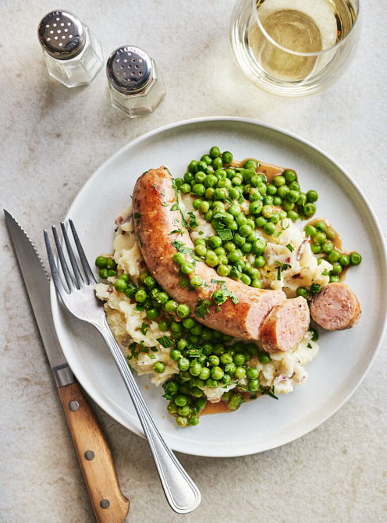 Plat: Saucisse à rôtir maison (recette R. Kuster), gratin de pomme de terre, petits pois carotte